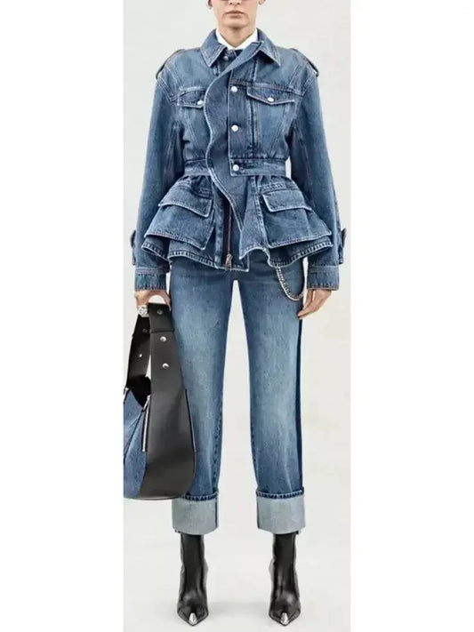 Light Blue Washed Denim Ruffle Peplum Jacket