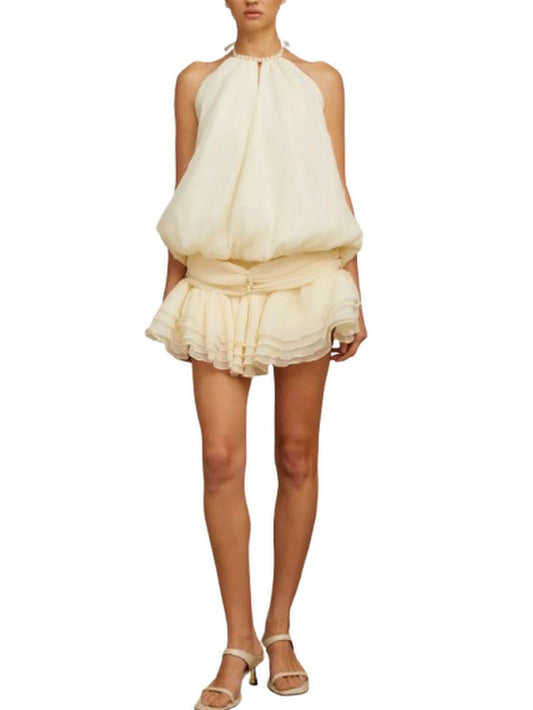 Faux-Pearl Halter-Neck Sleeveless Tiered Mini Dress