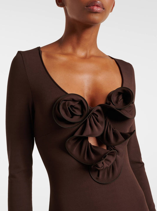 Floral Applique Ruffled Ruched Beige Mini Dress
