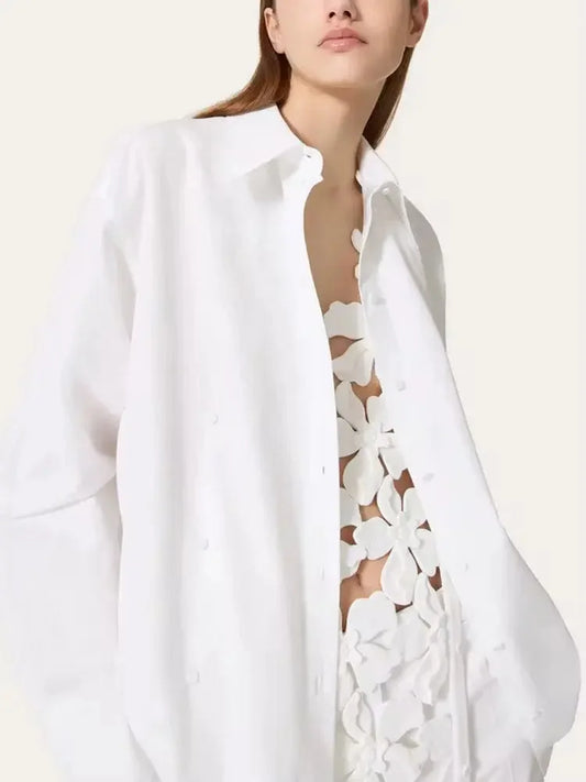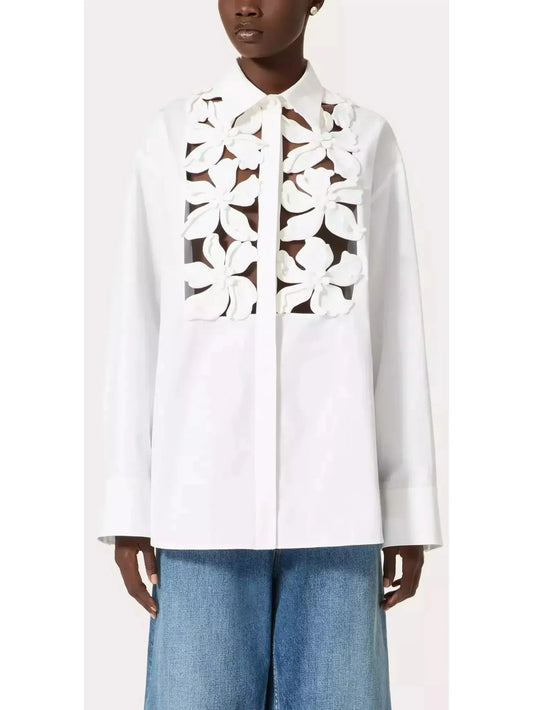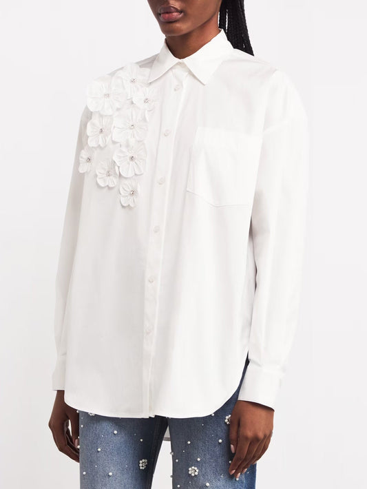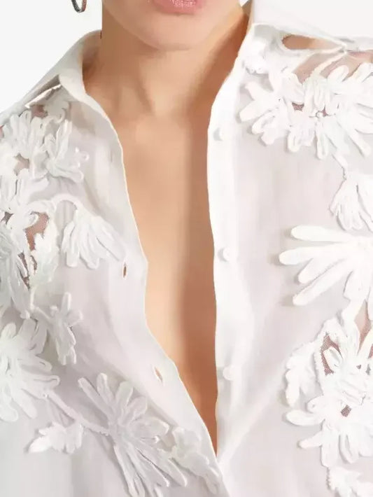 Floral Appliques White Cotton Shirt