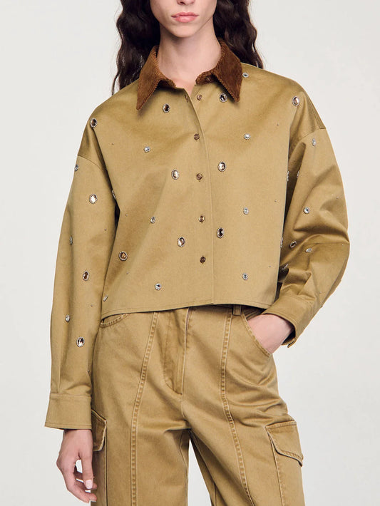 Crystal-Embellished Cropped Shirt with Corduroy Collar