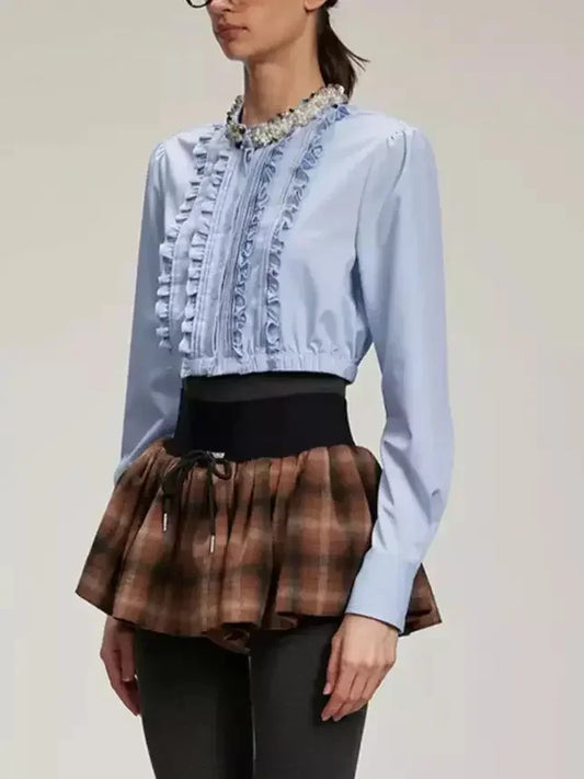 Embellished-Collar Ruffled Crop Shirt in Blue