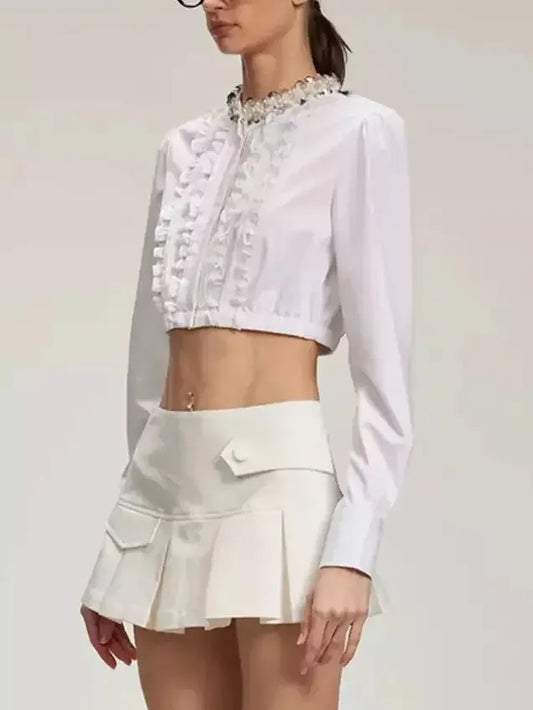 Embellished-Collar Ruffled Crop Shirt in White