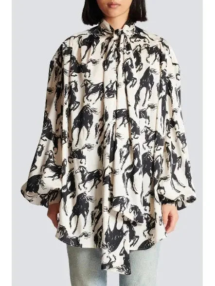 Horses Printed Silk Shirt with Neck-Tie