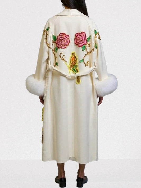 Floral-Embroidered Oversize Wool Coat with Fur Cuffs