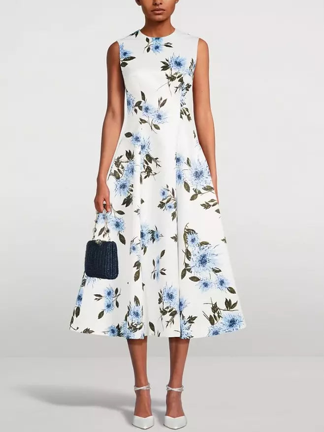 Step into elegance with our Blue Dahlia Print Taffeta-Faille Dress, where timeless floral beauty meets refined craftsmanship. This sleeveless, fit-and-flare midi silhouette features a crisp white base adorned with vivid blue dahlias—evoking the charm of a blooming garden in spring.