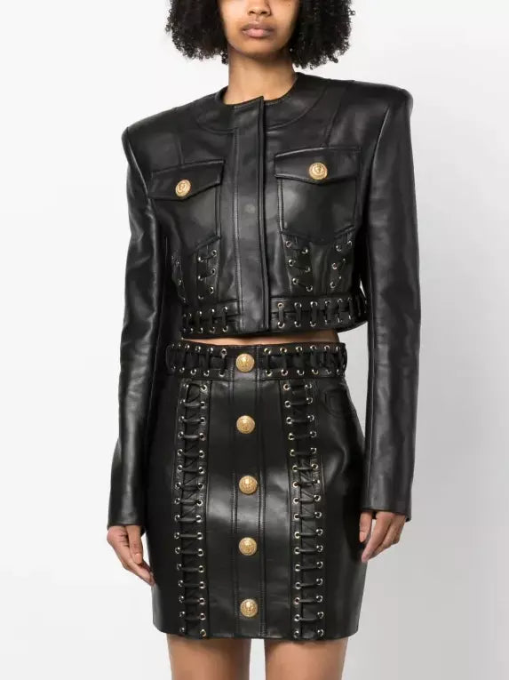 Our Eyelet-Embellished Cropped Leather Jacket is a standout piece from Branna Couture, designed for women who appreciate modern luxury fashion.