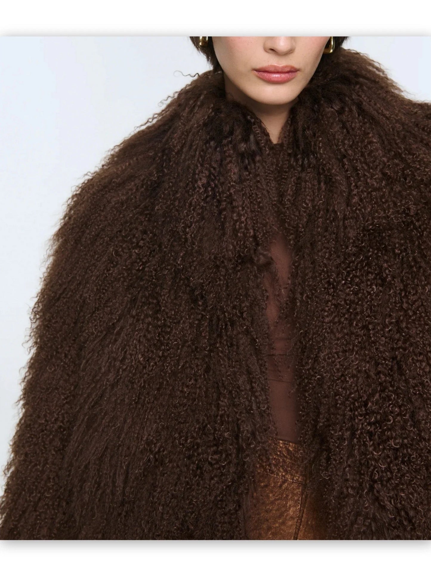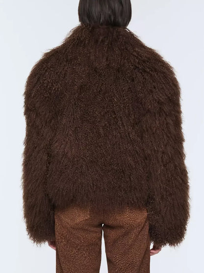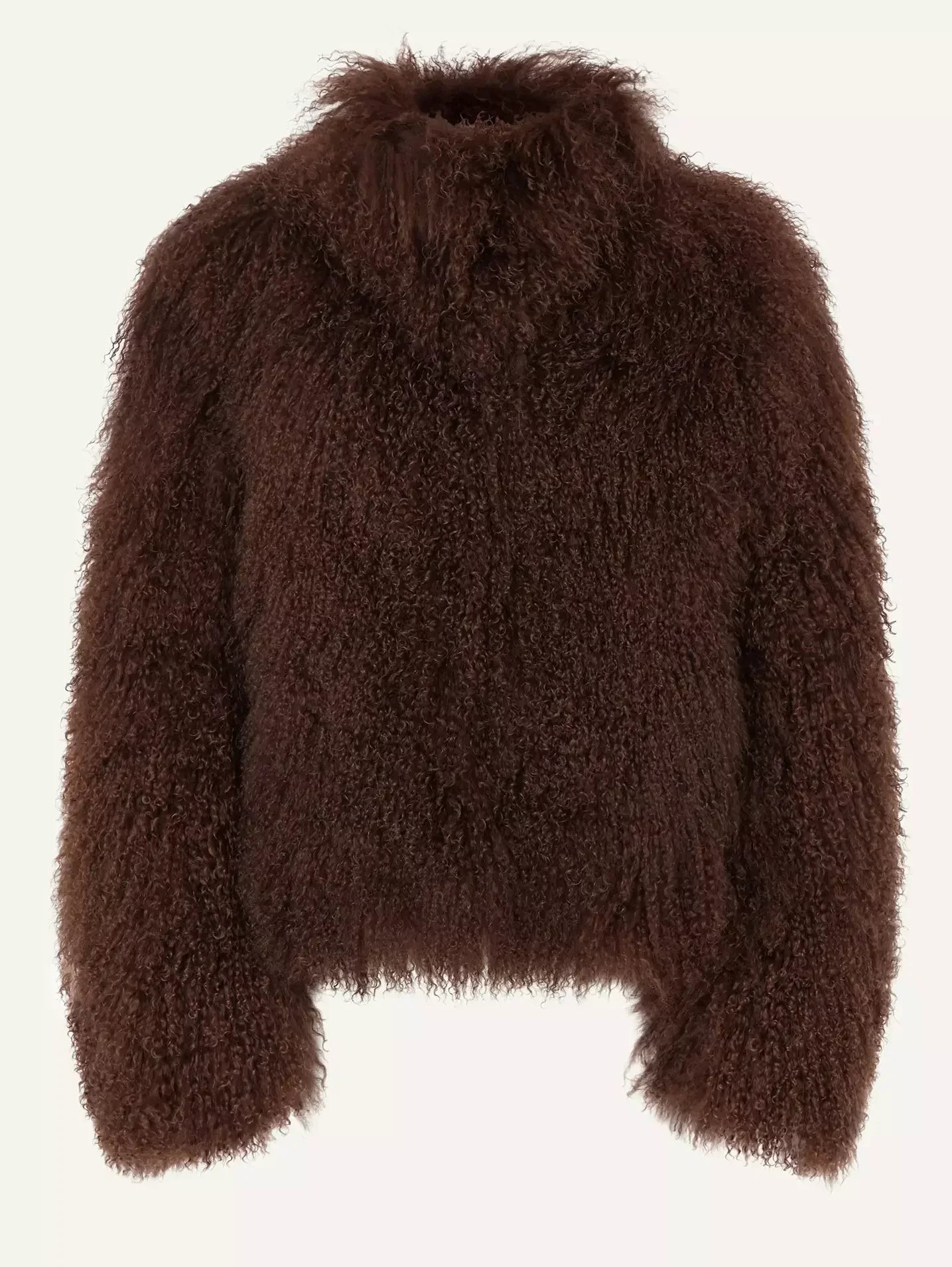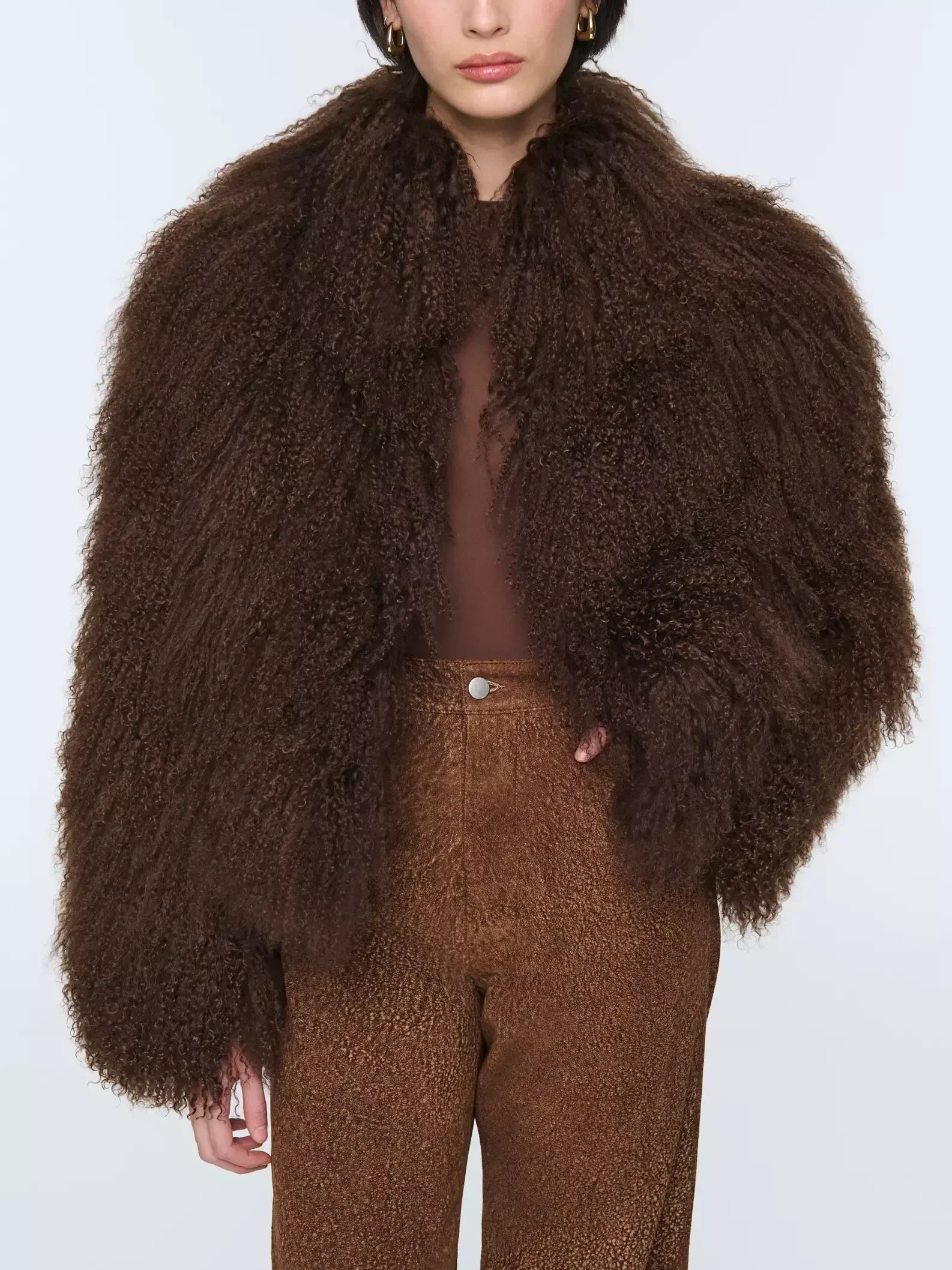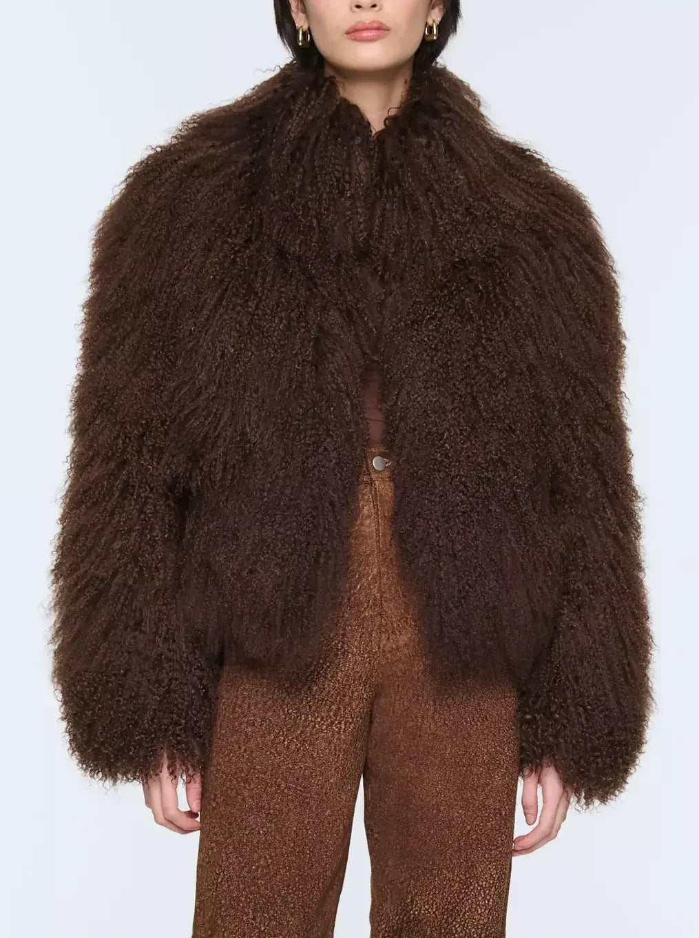 Full Mongolian Sheepskin Jacket in Dark Brown at Branna Couture