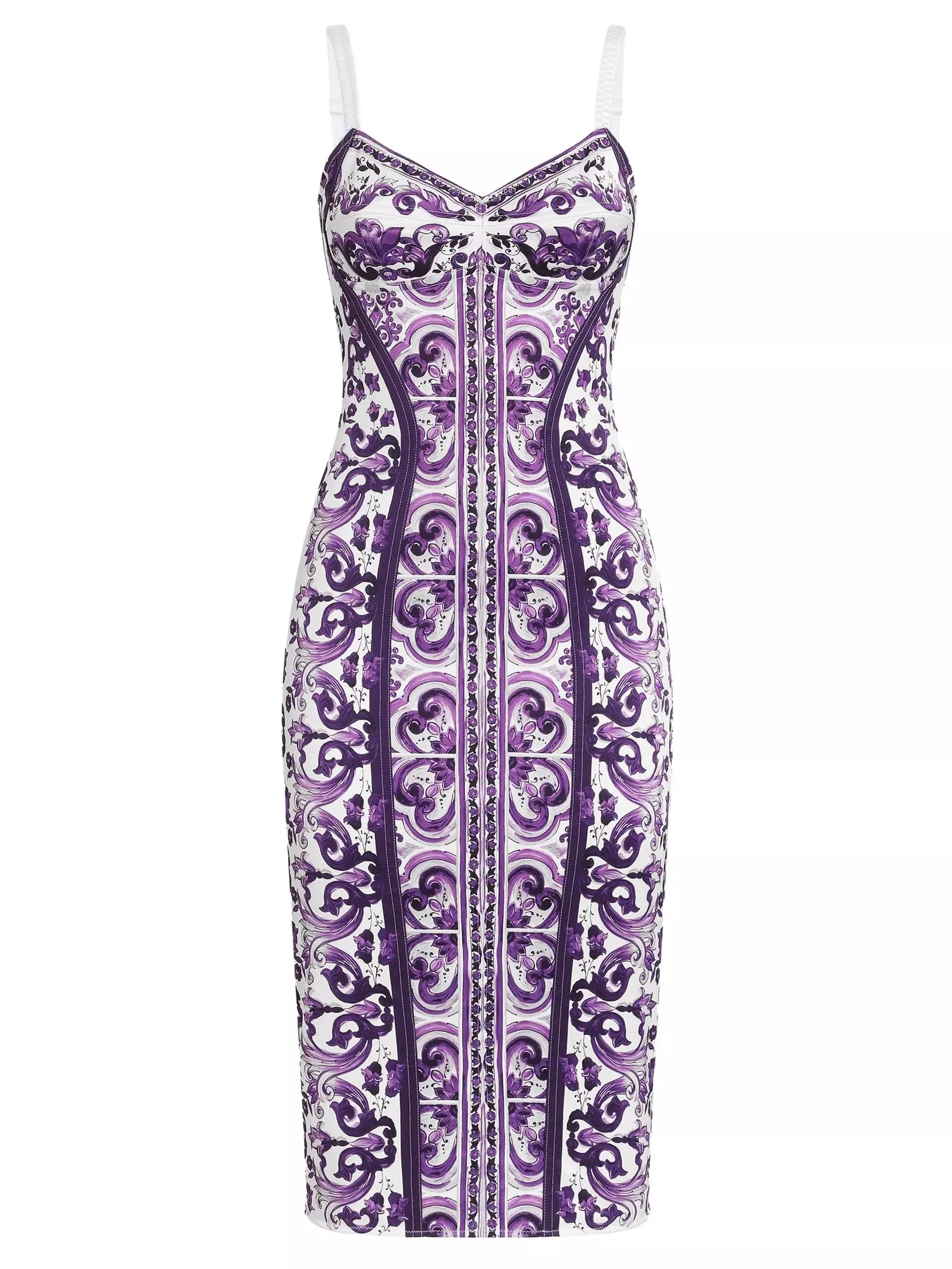 Elevate your warm-weather wardrobe with the Majolica Italian Print Charmeuse Corset Dress from Branna Couture. Crafted from sumptuous pure silk charmeuse, this sleeveless mid-length dress showcases a bold majolica tile print, available in red and white or purple and white—each echoing the artistry of classic Sicilian ceramics.