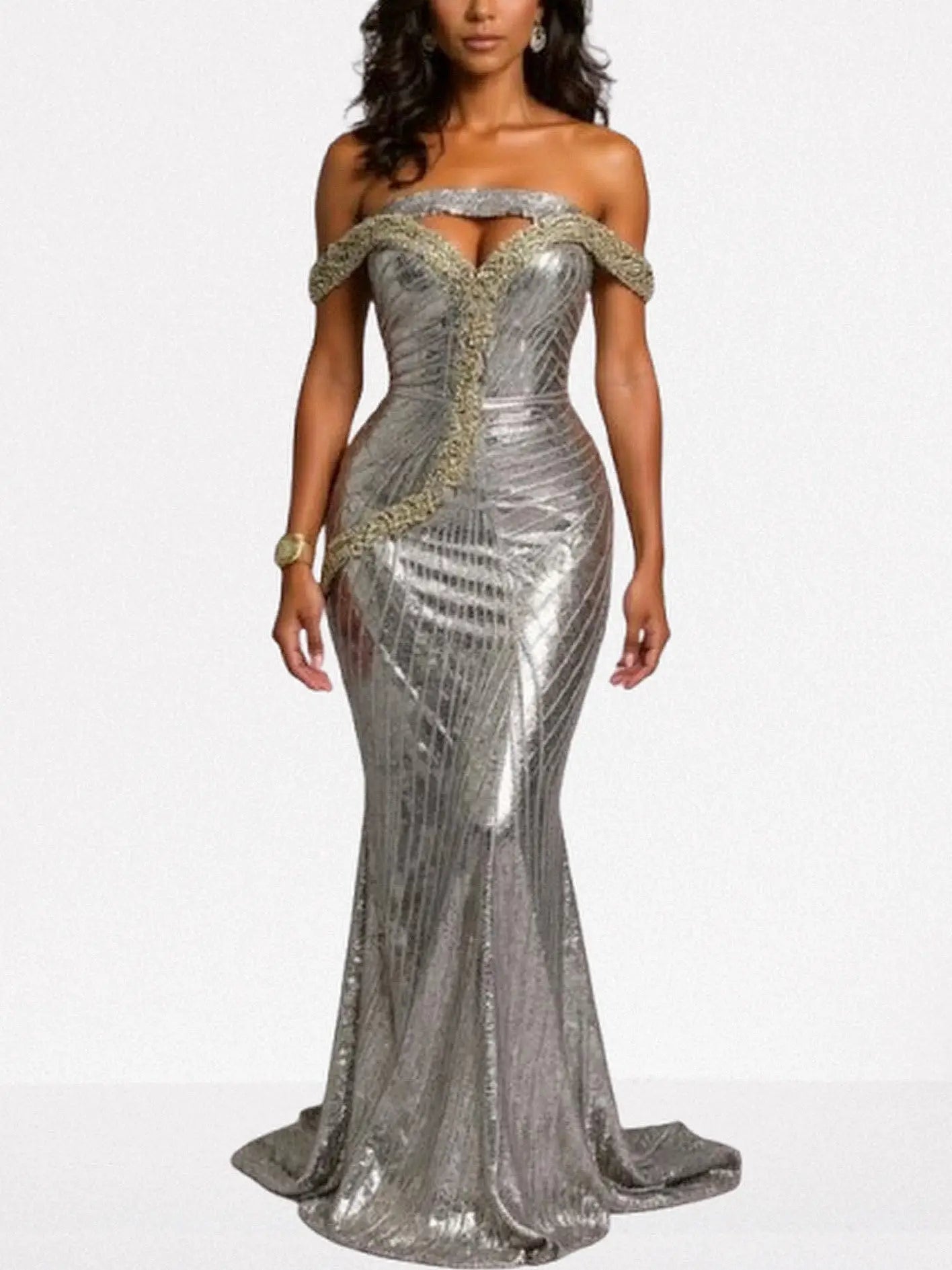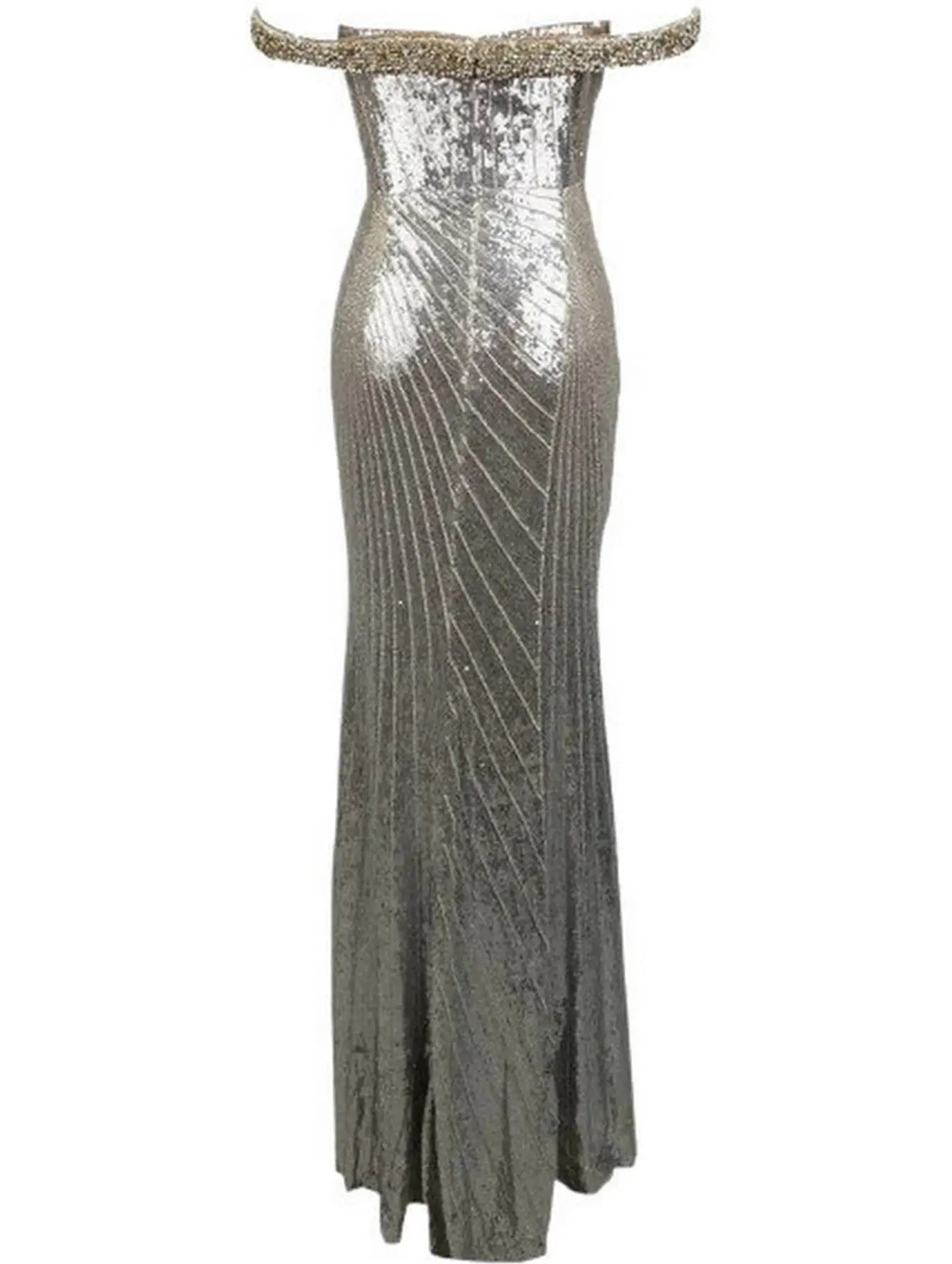 Command attention in the Off-Shoulder Sequin and Crystal Embellished Gown, a breathtaking silver and gold creation that radiates opulence. This sculpted mermaid-style gown shimmers with liquid silver sequins, while crystal and bead embellishments add multidimensional brilliance. The off-shoulder neckline, framed with a gold crystal trim and elegant collar cutout, highlights the décolletage with striking sophistication. Designed with a floor-length silhouette and slight stretch for a flawless fit, this gown captures timeless glamour with every movement—perfect for red-carpet events, galas, and evening soirées.